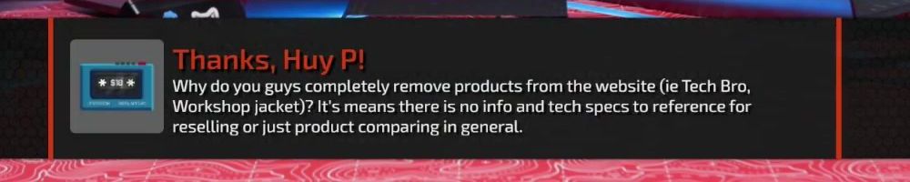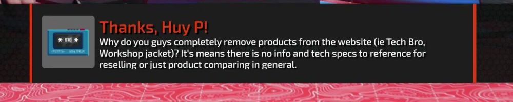 Thanks, Huy P! Why do you guys completely remove products from the website (ie Tech Bro, Workshop jacket)? It's means there is no info and tech specs to reference for reselling or just product comparing in general.