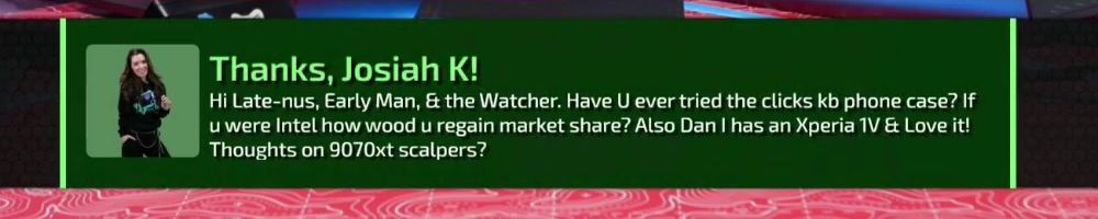 Thanks, Josiah K! Hi Late-nus, Early Man, & the Watcher. Have U ever tried the clicks kb phone case? If u were Intel how wood u regain market share? Also Dan I has an Xperia 1V & Love it! Thoughts on 9070xt scalpers?