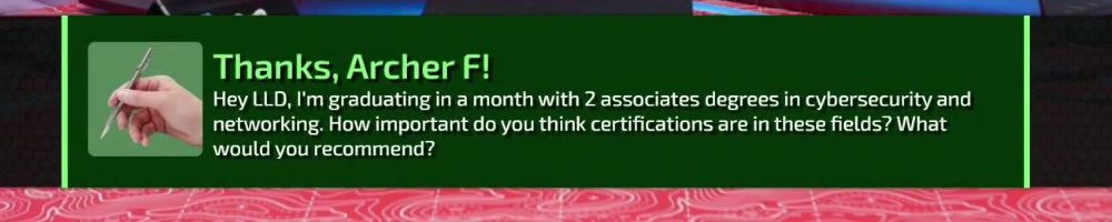 Thanks, Archer F! Hey LLD, I'm graduating in a month with 2 associates degrees in cybersecurity and networking. How important do you think certifications are in these fields? What would you recommend?