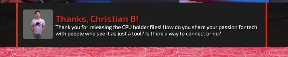 Thanks, Christian B! Thank you for releasing the CPU holder files! How do you share your passion for tech with people who see it as just a tool? Is there a way to connect or no?