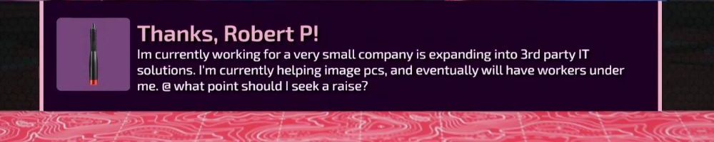 Thanks, Robert P! Im currently working for a very small company is expanding into 3rd party IT solutions. I'm currently helping image pcs, and eventually will have workers under me. @ what point should | seek a raise?