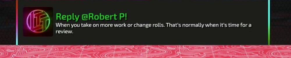 Reply @Robert P! When you take on more work or change rolls. That's normally when it's time for a review.