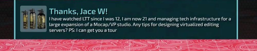 Thanks, Jace W! I have watched LTT since I was 12, I am now 21 and managing tech infrastructure for a large expansion of a Mocap/VP studio. Any tips for designing virtualized editing servers? PS: I can get you a tour