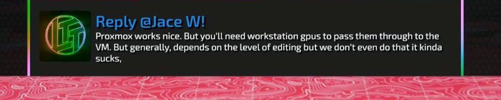Reply @Jace W! Proxmox works nice. But you'll need workstation gpus to pass them through to the VM. But generally, depends on the level of editing but we don't even do that it kinda sucks,