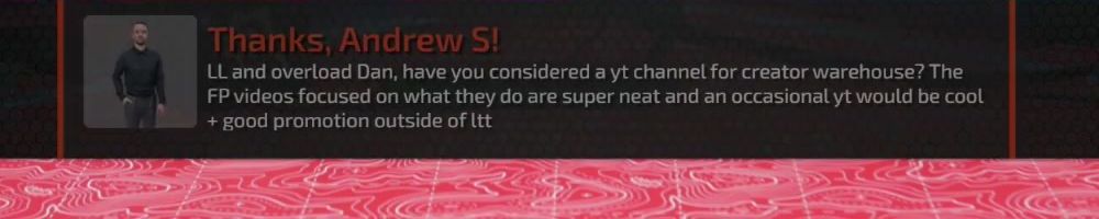 Thanks, Andrew S! LL and overload Dan, have you considered a yt channel for creator warehouse? The FP videos focused on what they do are super neat and an occasional yt would be cool + good promotion outside of Ltt