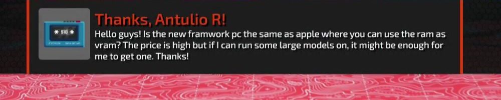 Thanks, Antulio R! Hello guys! Is the new framwork pc the same as apple where you can use the ram as vram? The price is high but if I can run some large models on, it might be enough for me to get one. Thanks!