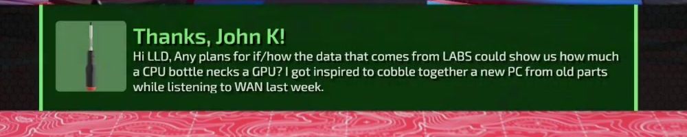 Thanks, John K! Hi LLD, Any plans for if/how the data that comes from LABS could show us how much a CPU bottle necks a GPU? I got inspired to cobble together a new PC from old parts while listening to WAN last week.