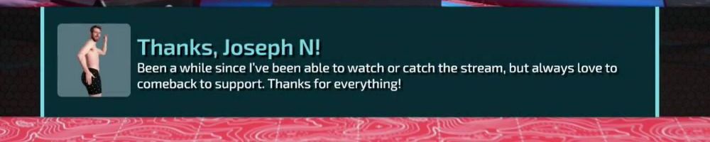 Thanks, Joseph N! Been a while since I've been able to watch or catch the stream, but always love to comeback to support. Thanks for everything!