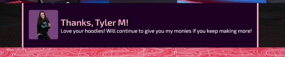 Thanks, Tyler M! Love your hoodies! Will continue to give you my monies if you keep making more!