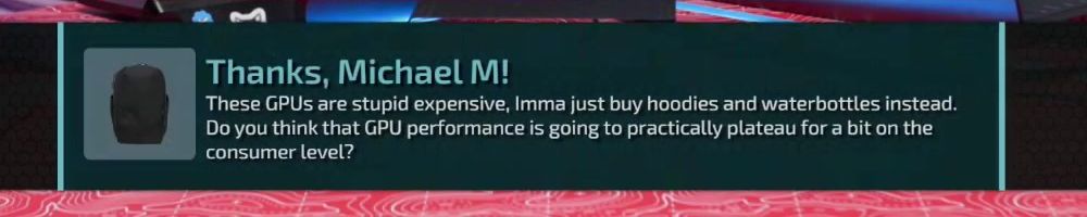 Thanks, Michael M! These GPUs are stupid expensive, Imma just buy hoodies and waterbottles instead. Do you think that GPU performance is going to practically plateau for a bit on the consumer level?