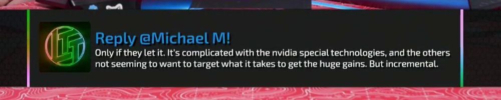 Reply @Michael M! Only if they let it. It's complicated with the nvidia special technologies, and the others not seeming to want to target what it takes to get the huge gains. But incremental.