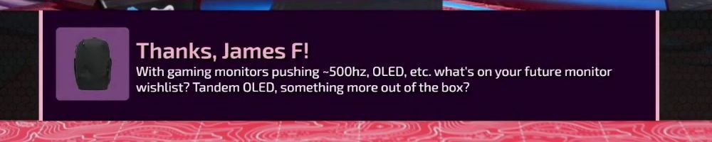 Thanks, James F! With gaming monitors pushing ~500hz, OLED, etc. what's on your future monitor wishlist? Tandem OLED, something more out of the box?