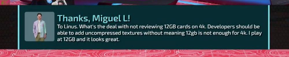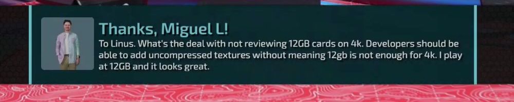Thanks, Miguel L! To Linus. What's the deal with not reviewing 12GB cards on 4k. Developers should be able to add uncompressed textures without meaning 12gb is not enough for 4k. | play at 12GB and it looks great.