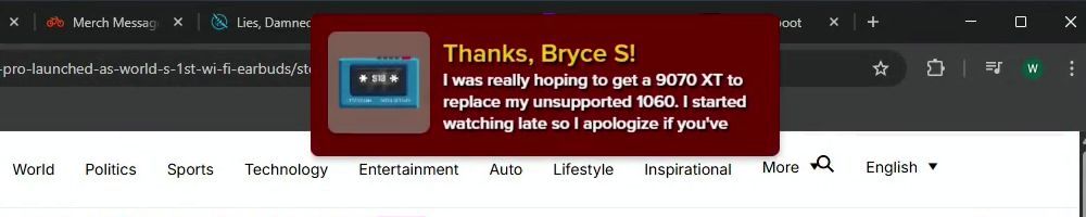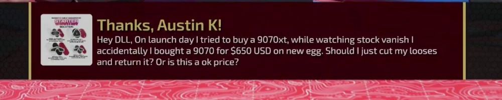 Thanks, Bryce S! I was really hoping to get a 9070 XT to replace my unsupported 1060. I started watching late so I apologize if you've