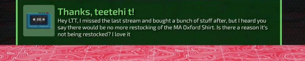 Hint: Use CTRL + F to search messages in this show, or use Whenplane's WAN Show Search tool to search for messages in all shows. Make sure that the "Merch Messages" box is checked when you search for something.