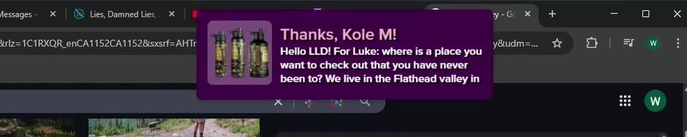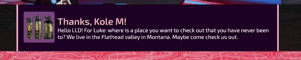 Thanks, Kole M! Hello LLD! For Luke: where is a place you want to check out that you have never been to? We live in the Flathead valley in