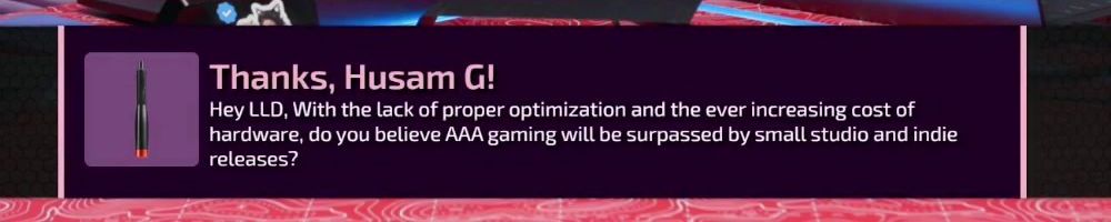Thanks, Husam G! Hey LLD, With the lack of proper optimization and the ever increasing cost of hardware, do you believe AAA gaming will be surpassed by small studio and indie releases?