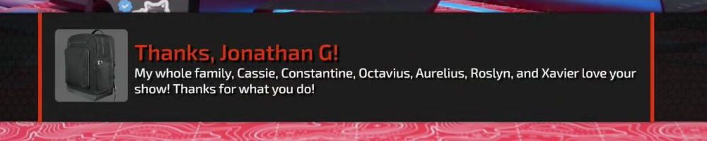 Thanks, Jonathan G! My whole family, Cassie, Constantine, Octavius, Aurelius, Roslyn, and Xavier love your show! Thanks for what you do!