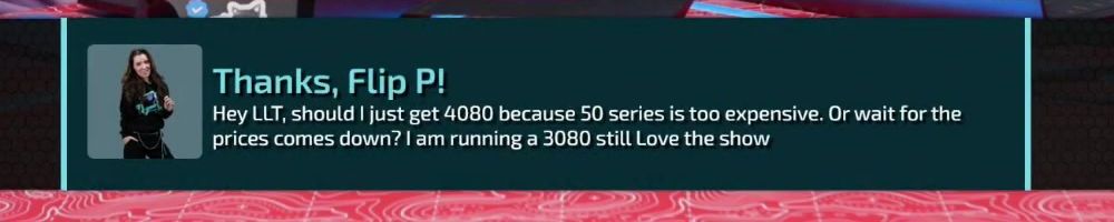 Thanks, Flip P! Hey LLT, should I just get 4080 because 50 series is too expensive. Or wait for the prices comes down? I am running a 3080 still Love the show