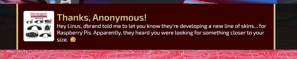 Thanks, Anonymous! Hey Linus, dbrand told me to let you know they're developing a new line of skins... for Raspberry Pis. Apparently, they heard you were looking for something closer to your size. 😳