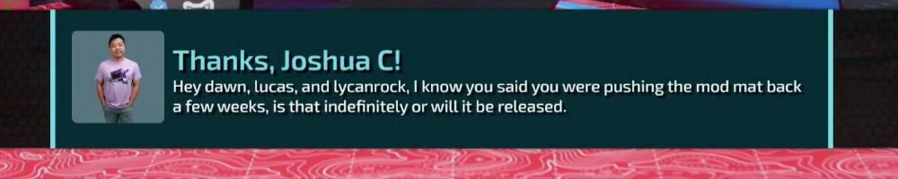 Thanks, Joshua C! Hey dawn, lucas, and lycanrock, I know you said you were pushing the mod mat back a few weeks, is that indefinitely or will it be released.