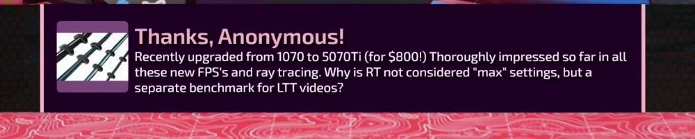 Thanks, Anonymous! Recently upgraded from 1070 to 5070Ti (for $800!) Thoroughly impressed so far in all these new FPS's and ray tracing. Why is RT not considered "max" settings, but a separate benchmark for LTT videos?