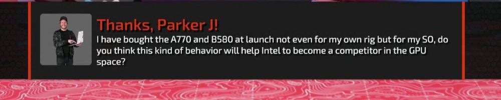 Thanks, Parker J! I have bought the A770 and B580 at launch not even for my own rig but for my SO, do you think this kind of behavior will help Intel to become a competitor in the GPU space?
