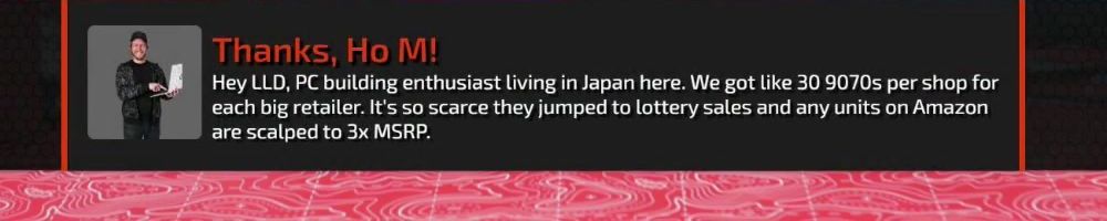 Thanks, Ho M! Hey LLD, PC building enthusiast living in Japan here. We got like 30 9070s per shop for each big retailer. It's so scarce they jumped to lottery sales and any units on Amazon are scalped to 3x MSRP.
