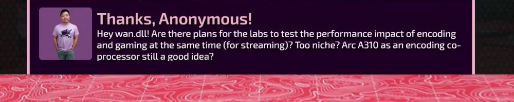 Thanks, Anonymous! Hey wan.dll! Are there plans for the labs to test the performance impact of encoding and gaming at the same time (for streaming)? Too niche? Arc A310 as an encoding co- processor still a good idea?