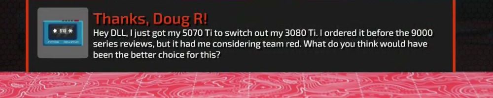Thanks, Doug R! Hey DLL, I just got my 5070 Ti to switch out my 3080 Ti. I ordered it before the 9000 series reviews, but it had me considering team red. What do you think would have been the better choice for this?