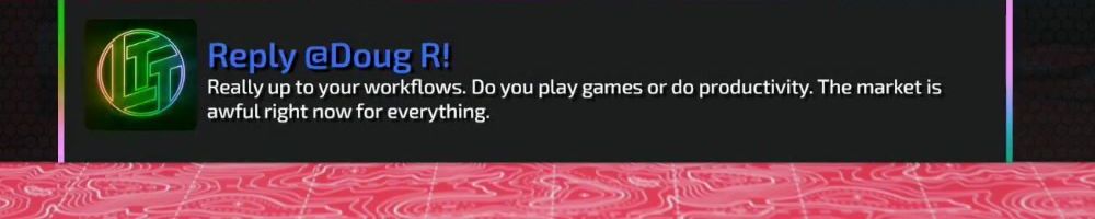 Reply @Doug R! Really up to your workflows. Do you play games or do productivity. The market is awful right now for everything.