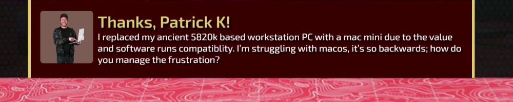 Thanks, Patrick K! I replaced my ancient 5820k based workstation PC with a mac mini due to the value and software runs compatibility. I'm struggling with macOS, it's so backwards; how do you manage the frustration?