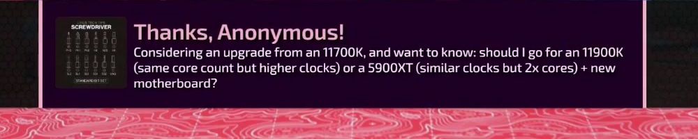 Thanks, Anonymous! Considering an upgrade from an 11700K, and want to know: should I go for an 11900K (same core count but higher clocks) or a 5900XT (similar clocks but 2x cores) + new motherboard?