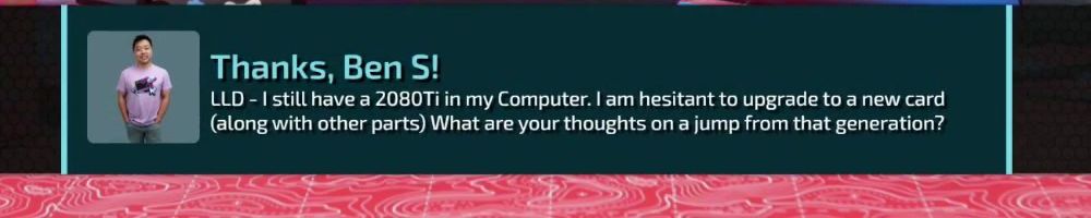 Thanks, Ben S! LLD - I still have a 2080Ti in my Computer. I am hesitant to upgrade to a new card (along with other parts) What are your thoughts on a jump from that generation?