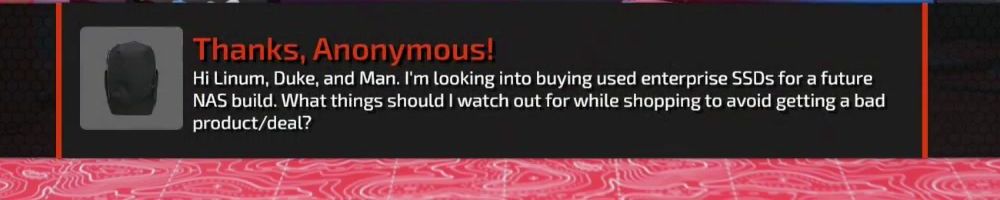Thanks, Anonymous! Hi Linum, Duke, and Man. I'm looking into buying used enterprise SSDs for a future NAS build. What things should I watch out for while shopping to avoid getting a bad product/deal?