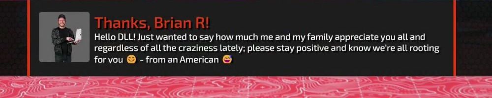 Thanks, Brian R! Hello DLL! Just wanted to say how much me and my family appreciate you all and regardless of all the craziness lately; please stay positive and know we're all rooting for you 😊 - from an American 🇺🇸