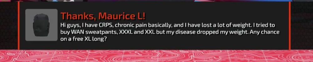 Thanks, Maurice L! Hi guys, I have CRPS, chronic pain basically, and I have lost a lot of weight. I tried to buy WAN sweatpants, XXXL and XXL but my disease dropped my weight. Any chance on a free XL long?