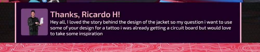 Thanks, Ricardo H! Hey all, I loved the story behind the design of the jacket so my question i want to use some of your design for a tattoo i was already getting a circuit board but would love to take some inspiration