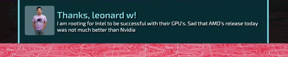 Thanks, leonard w! I am rooting for Intel to be successful with their GPU's. Sad that AMD's release today was not much better than Nvidia