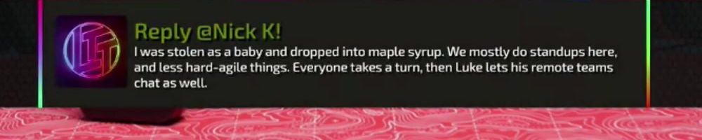 Reply @Nick K! I was stolen as a baby and dropped into maple syrup. We mostly do standups here, and less hard-agile things. Everyone takes a turn, then Luke lets his remote teams chat as well.