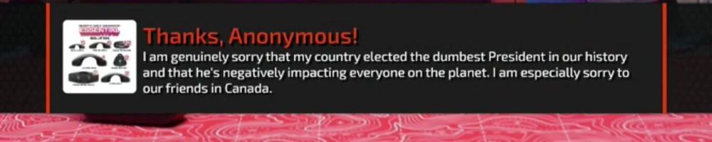 Thanks, Anonymous! I am genuinely sorry that my country elected the dumbest President in our history and that he's negatively impacting everyone on the planet. I am especially sorry to our friends in Canada.