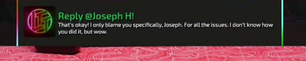 Reply @Joseph H! That's okay! I only blame you specifically, Joseph. For all the issues. I don't know how you did it, but wow.