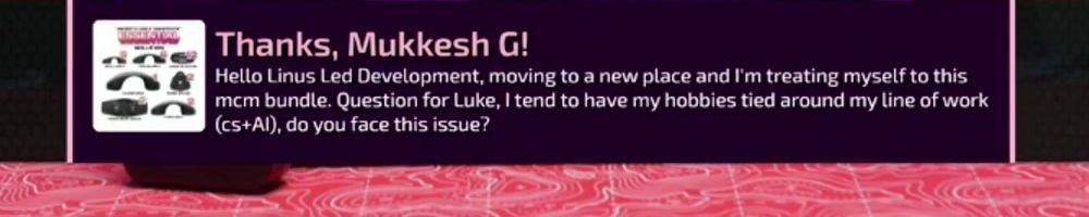 Thanks, Mukkesh G! Hello Linus Led Development, moving to a new place and I'm treating myself to this mcm bundle. Question for Luke, I tend to have my hobbies tied around my line of work (cs+AI), do you face this issue?