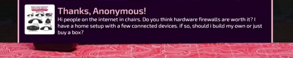 Thanks, Anonymous! Hi people on the internet in chairs. Do you think hardware firewalls are worth it? I have a home setup with a few connected devices. if so, should i build my own or just buy a box?