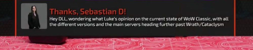 Thanks, Sebastian D! Hey DLL, wondering what Luke's opinion on the current state of WoW Classic, with all the different versions and the main servers heading further past Wrath/Cataclysm