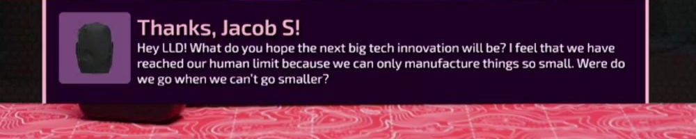 Thanks, Jacob S! Hey LLD! What do you hope the next big tech innovation will be? I feel that we have reached our human limit because we can only manufacture things so small. Were do we go when we can't go smaller?