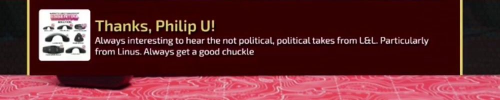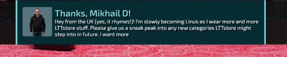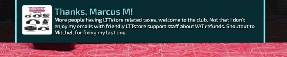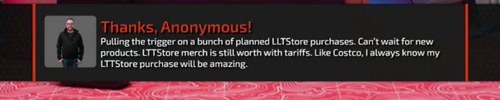 Thanks, Anonymous! Pulling the trigger on a bunch of planned LLTStore purchases. Can't wait for new products. LTTStore merch is still worth with tariffs. Like Costco, I always know my LTTStore purchase will be amazing.