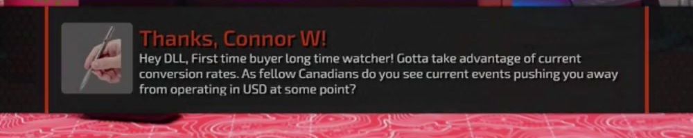 Thanks, Connor W! Hey DLL, First time buyer long time watcher! Gotta take advantage of current conversion rates. As fellow Canadians do you see current events pushing you away from operating in USD at some point?