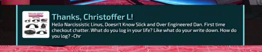 Thanks, Christoffer L! Hello Narcissistic Linus, Doesn't Know Slick and Over Engineered Dan. First time checkout chatter. What do you log in your life? Like what do your write down. How do you log? -Chr