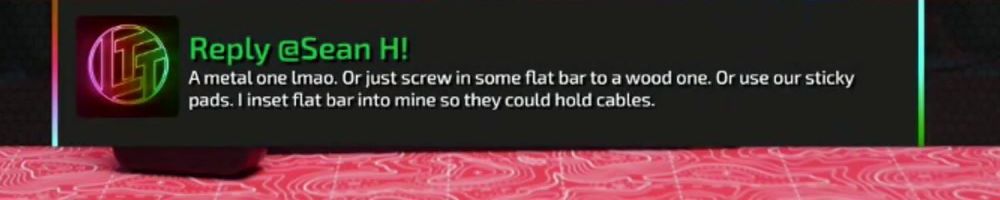Reply @Sean H! A metal one lmao. Or just screw in some flat bar to a wood one. Or use our sticky pads. I inset flat bar into mine so they could hold cables.